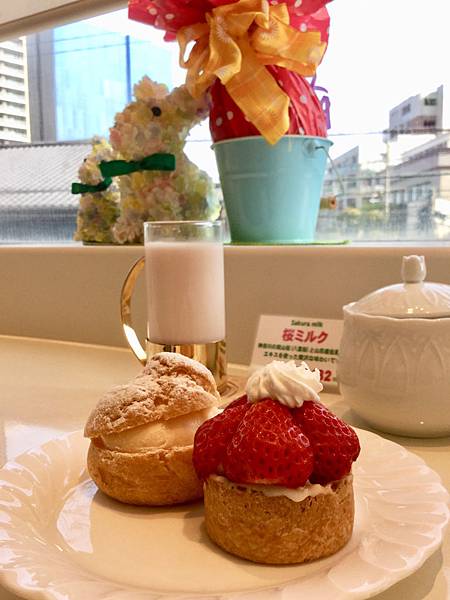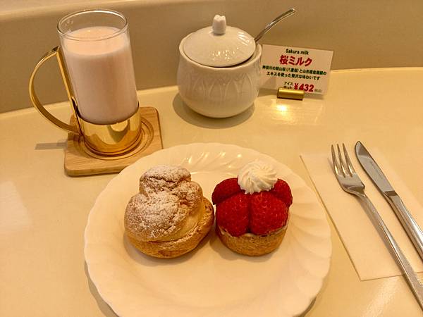 我去了兩次都是在樓上咖啡廳,先介紹一下,如果要在樓上咖啡廳食用蛋糕的話,得要先在一樓跟櫃檯先確認樓上有位置,因為咖啡廳只有10個人的座位而已,確定有位置就可以點蛋糕了,點完蛋糕後櫃檯的人會和你一起搭電梯上去,上去二樓會換成二樓一位很有氣質的阿姨(去了兩次都是她),這位阿姨真的非常貼心又有氣質(真的很有氣質所以要說三遍),上去咖啡廳基本都要點一杯飲料,第一次去我點了當時季節限定的「櫻花牛奶」,無敵好喝呀(眼睛張大)!!!而後第二次去就沒了,好空虛好難過,當時和我一起去的友人還會時不時吵鬧說想喝16區的櫻花牛奶。